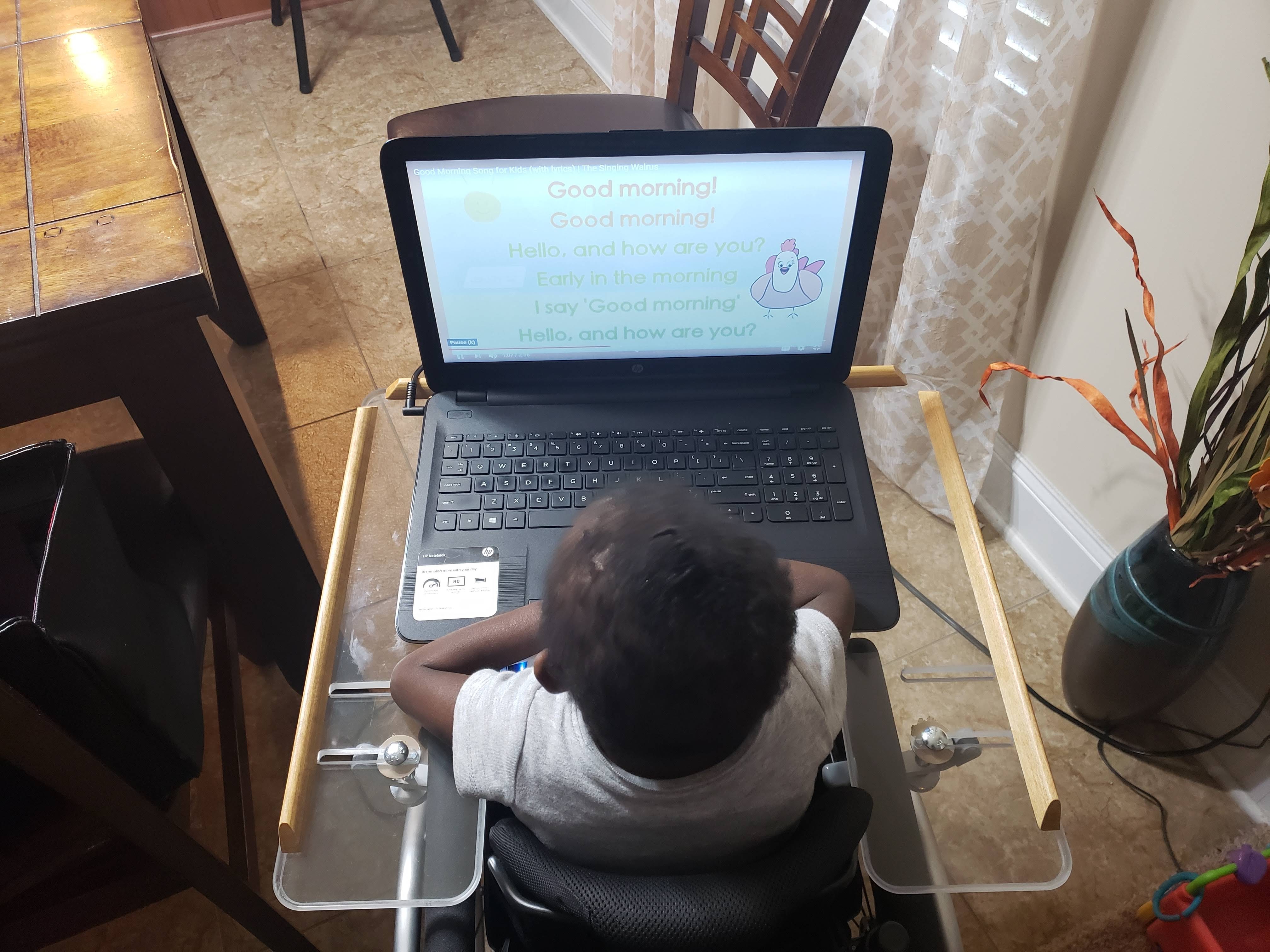 This is one of the first days of school. I listen to the morning song everyday. We do the art projects; and if I’m awake, we log on for live instruction time with the class. I get “private” instruction twice per week. I also get PT, OT, and speech one day a week each.